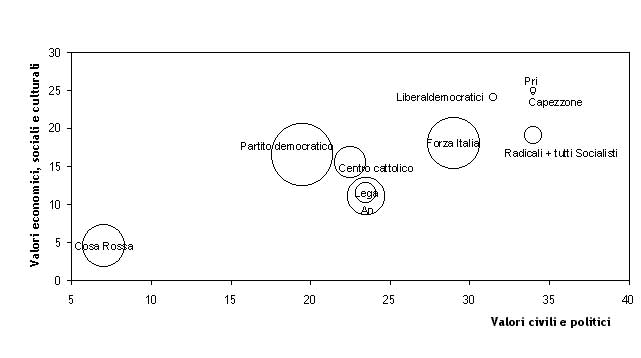 A questo punto, è stato possibile realizzare il diagramma, esposto all'inizio di questa nota, nel quale ciascuna forza politica è rappresentata con un cerchio di raggio proporzionale alla rispettiva percentuale di deputati e senatori. Si tratta di una mappa molto ricca e suscettibile di interessantissime analisi politiche. * * * Vediamo ora in estrema sintesi i 12 pacchetti di questioni irrisolte e quesiti Aree civili e politiche 1. Dispotismo della politica 1.1 Questione In Italia nel corso degli anni la politica ha sempre più invaso gli spazi della società, è venuto meno il principio di separazione tra amministrazione e politica, i poteri costituzionali e quello giudiziario sono stati pressati da una maggioranza sia essa di centro-sinistra o di centro-destra che si comporta come se fosse tale per sempre, le risorse collettive sono state espropriate in nome di una pletora di interessi pubblici presunti o malintesi o, peggio, traditi nella gestione politica: basti pensare che i dualismi storici della società italiana (territoriali, generazionali), il cui superamento era obiettivo delle politiche riformiste, oggi sono addirittura ampliati. È forse troppo sostenere che in Italia, nel dopoguerra, si è andata instaurando una via italiana al dispotismo della politica? 1.2 Quesito. Condividi che: Oggi in Italia il problema centrale sia il controllo politico asfissiante in ogni sfera della vita civile, economica, culturale e che il primo rimedio sia varare norme costituzionali che segnino i confini della legalità, separino rigidamente i poteri e consentano di ridurre la fiscalità generale? 2. Liberalismo politico 2.1 Questioni In Italia, soprattutto nel novecento, la penetrazione di concezioni nazionaliste o socialiste ha marginalizzato la tradizione liberal-democratica, la quale è stata conosciuta solo grazie a movimenti illuminati minoritari. Si sono avute conseguenze negative sullo stesso ordine legale e sulla progressiva restrizione dell'autonomia dei singoli. Gli individui invece vanno rispettati nei loro diritti inviolabili e non già considerati quali semplici componenti di un organismo più vasto: la collettività. Le visioni che subordinano le libertà dei singoli ad ogni (vero o presunto che sia) "interesse generale" sono in quanto tali del tutto incompatibili con un ordine di giustizia, così come è illegittimo ritenere che gli individui esistano solo quali membri di comunità e loro componenti. 2.2 Quesiti 2.2.1 Condividi che le istituzioni statali non possono invadere gli spazi di autonomia della società civile e delle sue articolazioni: famiglia, associazioni, comunità? 2.2.2 Condividi che gli apparati pubblici possono operare solo in funzione sussidiaria, intervenendo a sostegno di tali realtà soltanto quando esse non appaiano in grado di affrontare autonomamente i problemi che sono chiamate a risolvere? 3. Giustizia 3.1 Questione Tra le tante, quella a monte di tutte è che in Italia la magistratura è organizzata in correnti, in ciò riproducendo la configurazione dell'assemblea legislativa. Il potere giudiziario, pertanto, importa da quello legislativo i presupposti per un'inevitabile ideologizzazione e politicizzazione. Il principio liberale della separazione tra i poteri dello Stato è così violato. Le conseguenze inevitabili sono: rapporti conflittuali; inquinamento da contrapposizione di rappresentanza politica; carriera dei magistrati non per merito, ma per appartenenza a correnti; demotivazione dei magistrati migliori; i magistrati entrano in politica, poi tornano, inevitabilmente condizionati. Il CSM, organo disciplinare di autogoverno, ha una maggioranza di membri togati. Questo è un cascame di "correntocrazia" e impedisce una reale vigilanza. 3.2 Quesito. Ritieni giusto: Impedire che i magistrati si organizzino in correnti ed entrino in politica? 4. Laicità: Stato Religioni 4.1 Questione Stato e Chiesa sono stati protagonisti di rapporti complessi e complicati nella storia d'Italia. La stessa revisione del Concordato, voluta e realizzata dall'allora presidente del Consiglio Craxi e dal cardinal Casaroli, non fu nitidamente liberaldemocratica, nel senso della necessaria separazione tra la sfera del cittadino e quella del credente. Eppure quel mondo, quei problemi, quegli interrogativi sembrano lontani. Oggi in Occidente la questione della laicità dello Stato, della libertà di fede, dello stesso ruolo pubblico delle religioni presenta aspetti nuovi e diversi. La legislazione sulle cittadinanze, sull'immigrazione, sulle minoranze è divenuta argomento di lotta politica pressoché quotidiana, non più soltanto oggetto di riflessione storica e costituzionale. 4.2 Quesito. Ritieni che: Oggi in Italia la Costituzione, le leggi, le forze dell'ordine, la scuola debbano diffidare della retorica del multiculturalismo e operare invece perché sia credibile uno Stato laico, garante di libertà, ma attento alle esigenze di sicurezza e di integrazione delle minoranze nei propri valori occidentali? 5. Squilibrio demografico mondiale 5.1 Questione L'accrescimento della popolazione mondiale continua, insieme all'usura di risorse naturali, sia in società opulente, sia in quelle preindustriali e indigenti. Nel 1968 gli abitanti della Terra erano 3,5 miliardi, nel 2005 6,5 miliardi. Occorrono decisi passi verso un minimo sistema di equilibrio globale. Misure coercitive sulla natalità sarebbero però illiberali. Una società liberale si fa carico dei diritti fondamentali dei più deboli. 5.2 Quesito Premesso che è giusto che gli Stati assistano in misura sostenibile i cittadini più deboli sia i propri, sia quelli di nazioni in via di sviluppo nei loro diritti fondamentali (istruzione, sanità), ritieni opportuno che le organizzazioni mondiali e le chiese religiose si adoperino affinché, con adeguati programmi anche scolastici, le popolazioni della Terra vengano educate alla responsabilità individuale e familiare del controllo delle nascite? 6. Occidente e rapporti
