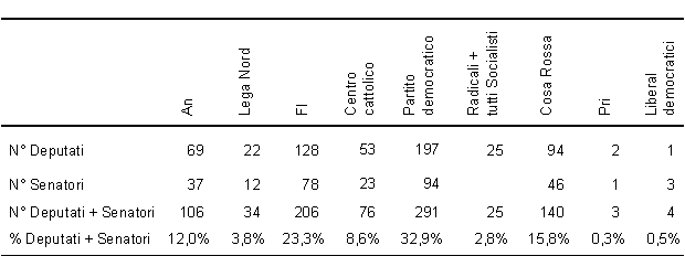 Per arrivarci, dobbiamo ripercorrere il filo logico della relazione. La premessa è che oggi in Italia i partiti che si richiamano alla tradizione liberaldemocratica sono sempre di più, quelli davvero liberali sempre di meno. Anzi, in tanta confusione viene voglia di riaffermare quei valori e prendere le misure di liberalismo a tutte le maggiori forze rappresentate in Parlamento. Per farlo, Gallo ha individuato come fondamentali 7 aree in cui si esplicano i valori liberali civili e politici (dispotismo della politica, liberalismo politico, giustizia, laicità, squilibrio demografico mondiale, Occidente e rapporti transatlantici, libertà di espressione) e 5 aree di valori economici, sociali e culturali (liberalismo economico, finanza pubblica, ambiente e bioetica, energia, ricerca). Per ciascuna di queste aree, in collaborazione con uno studioso della singola materia, Gallo ha definito quale è oggi nel nostro paese la questione fondamentale irrisolta, spartiacque tra chi vuole un'Italia e chi ne vuole un'altra, e ha estratto un quesito chiaro, breve, dirimente. Dunque, 12 questioni e 12 quesiti. A questo punto Gallo ha inserito i 12 quesiti in un questionario con una risposta da scegliere tra 5 alternative possibili: molto d'accordo (5 punti), d'accordo (4), neutrale (3), in disaccordo (2), molto in disaccordo (1). Ha poi fatto compilare il questionario a rappresentanti autorevoli delle maggiori forze politiche italiane. In alcuni casi, in uno sforzo di semplificazione, ha ipotizzato la nascita di nuove formazioni politiche attraverso l'aggregazione di forze tra esse molto omogenee. Quando per ragioni pratiche non è stato possibile ottenere la compilazione autentica, Gallo li ha compilati sotto la propria responsabilità con l'aiuto quesito per quesito degli stessi 12 intellettuali studiosi che l'avevano assistito nella formulazione delle questioni e dei quesiti. Per far ciò nel modo più scrupoloso, ha anche attinto ai più recenti documenti (programmi e/o manifesti) pubblicati dagli stessi partiti. Ha così rivolto l'attenzione a: Alleanza nazionale, Lega Nord, Forza Italia, Partito Repubblicano Italiano, Centro cattolico (Udc + Udeur), Partito democratico, Radicali + tutti i Socialisti, Liberaldemocratici, Cosa rossa (Verdi + Prc + Pdci + Sinistra democratica). Gallo ha poi costruito una mappa del posizionamento delle forze politiche in termini di liberalismo. Per far ciò, ha tracciato un diagramma avente sull'asse orizzontale il punteggio totale delle risposte ai quesiti civili e politici. E sull'asse verticale il punteggio totale delle risposte ai quesiti economici, sociali e culturali. Per rappresentare correttamente l'importanza diversificata delle varie forze politiche, Gallo ha ricostruito il numero di deputati e di senatori di ciascuna di esse. Poiché per le elezioni del 2006 le liste non consentono di dedurre l'appartenenza degli eletti ai rispettivi partiti, poiché inoltre ora sono nati il Partito democratico e i Liberaldemocratici, poiché infine gli ipotizzati Centro cattolico e Cosa rossa avrebbero parlamentari oggi appartenenti a partiti diversi, Gallo con l'ausilio di funzionari di Camera e Senato ha scorporato e riaggregato numeri e percentuali giungendo alla seguente tabella: